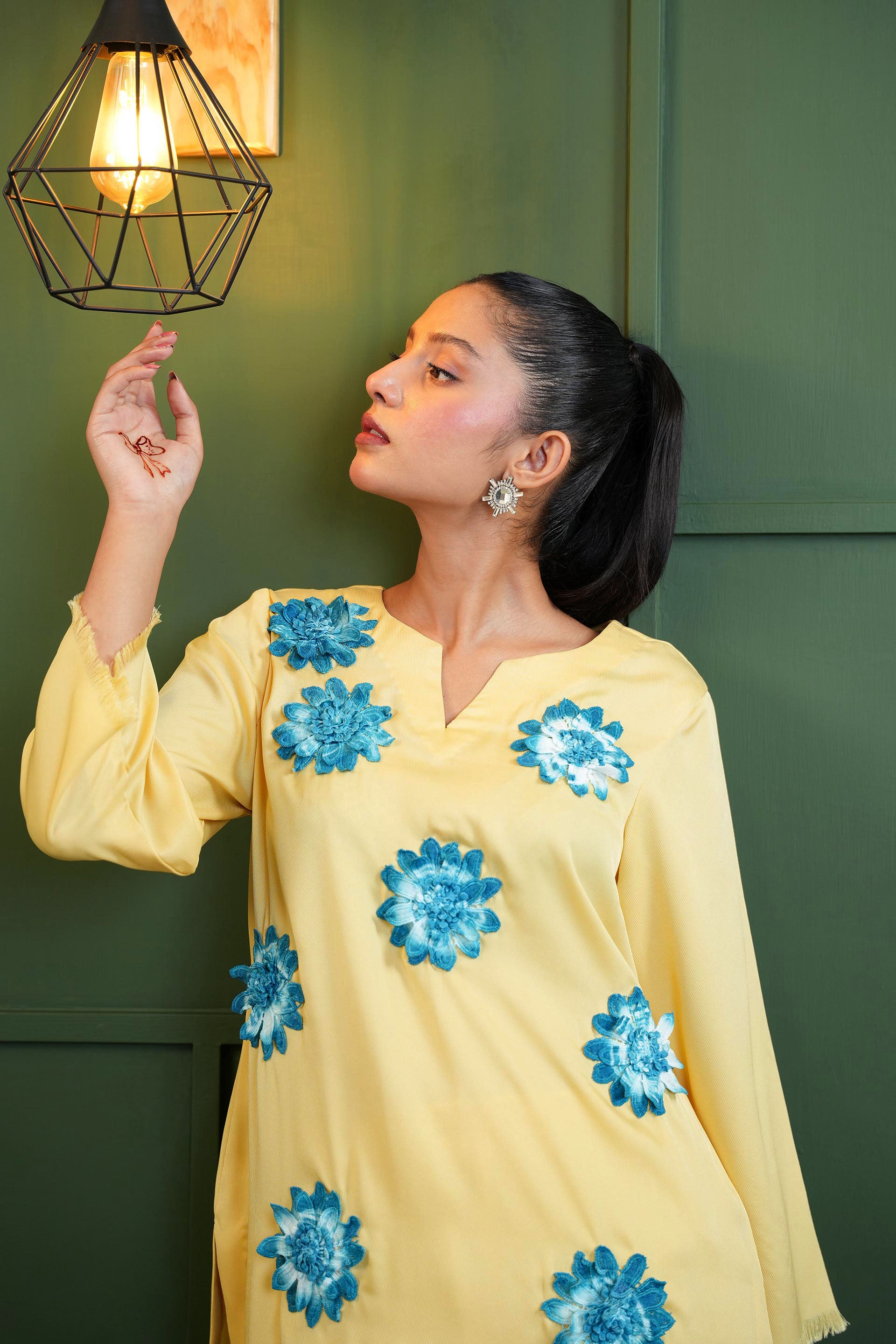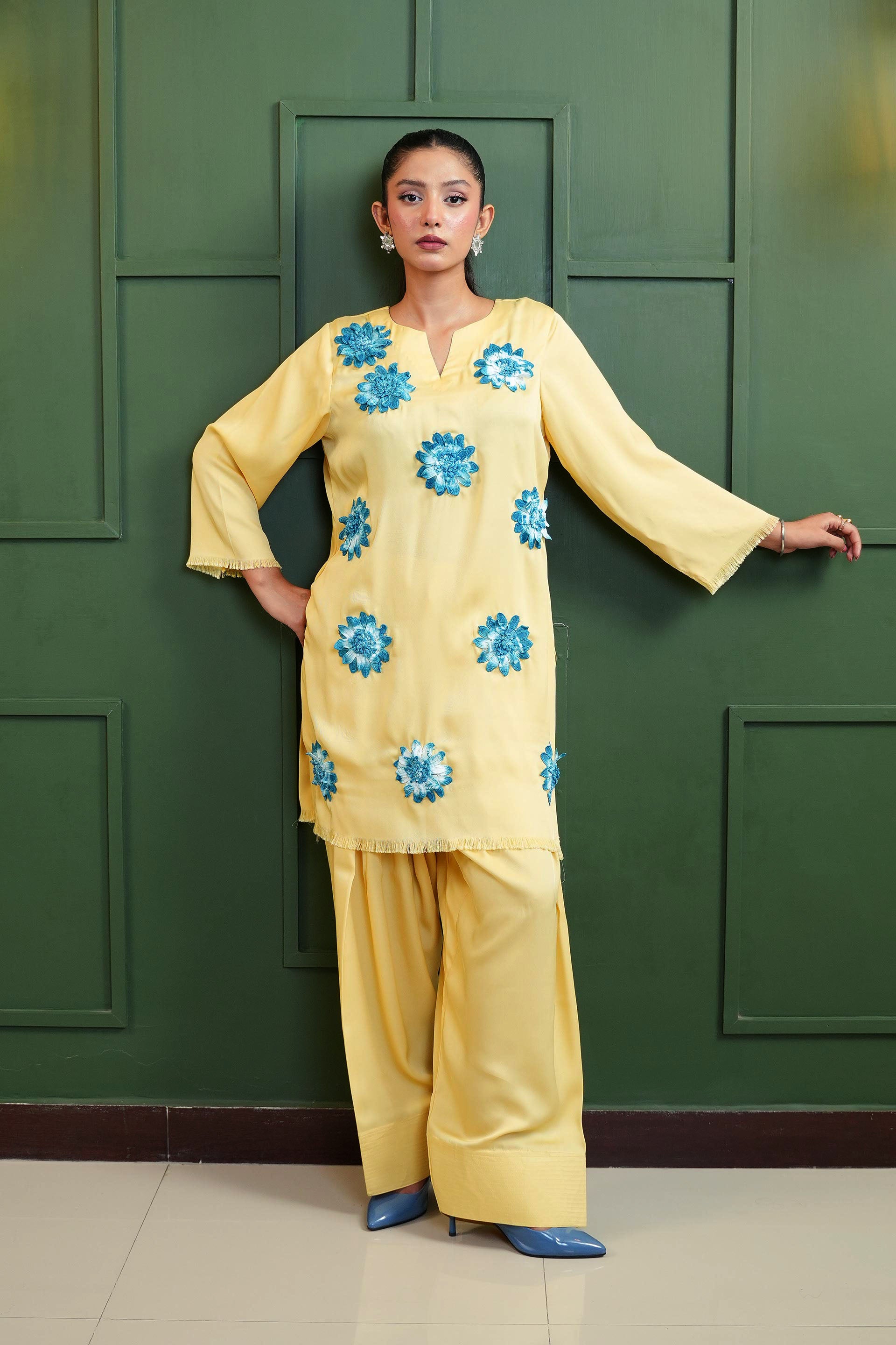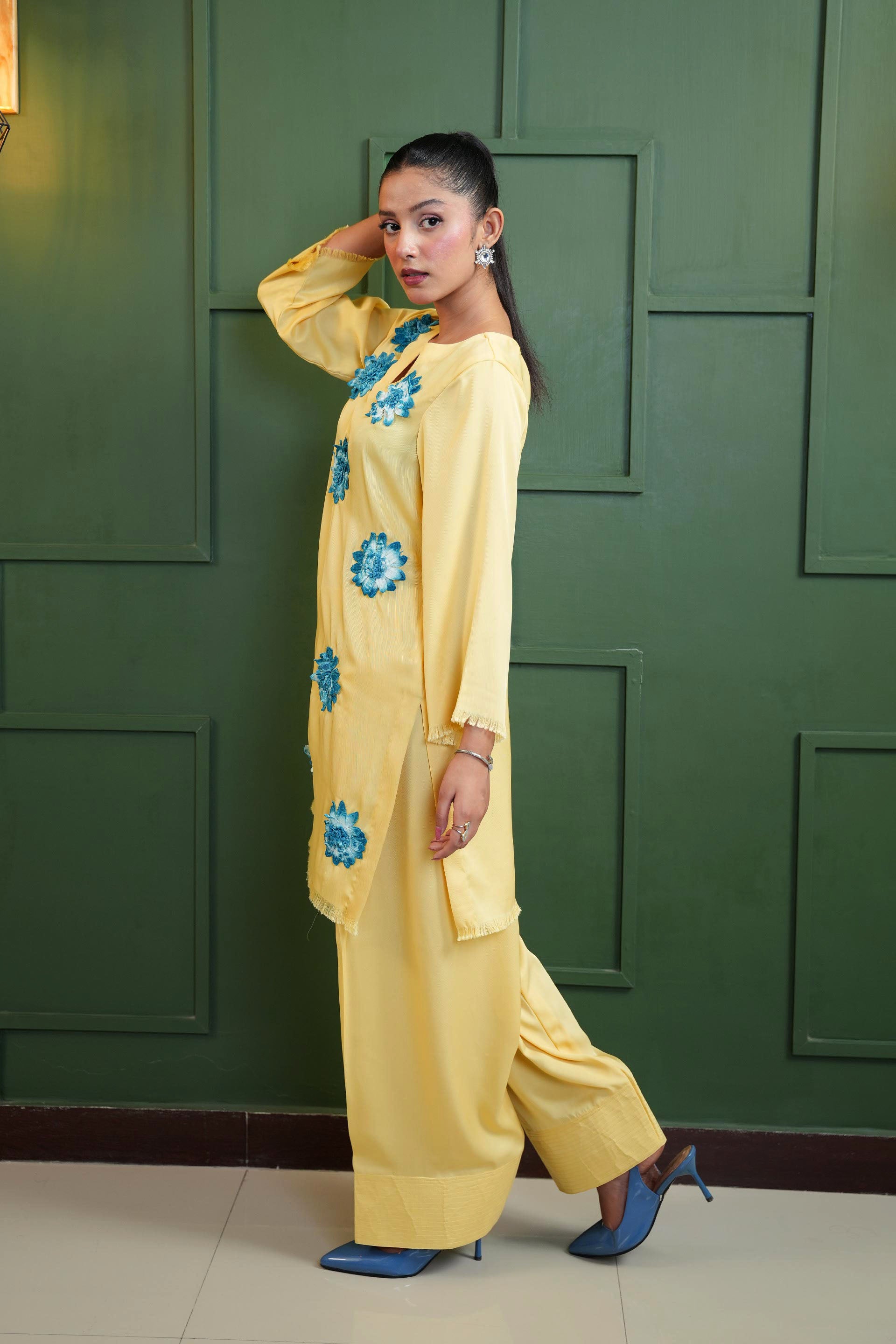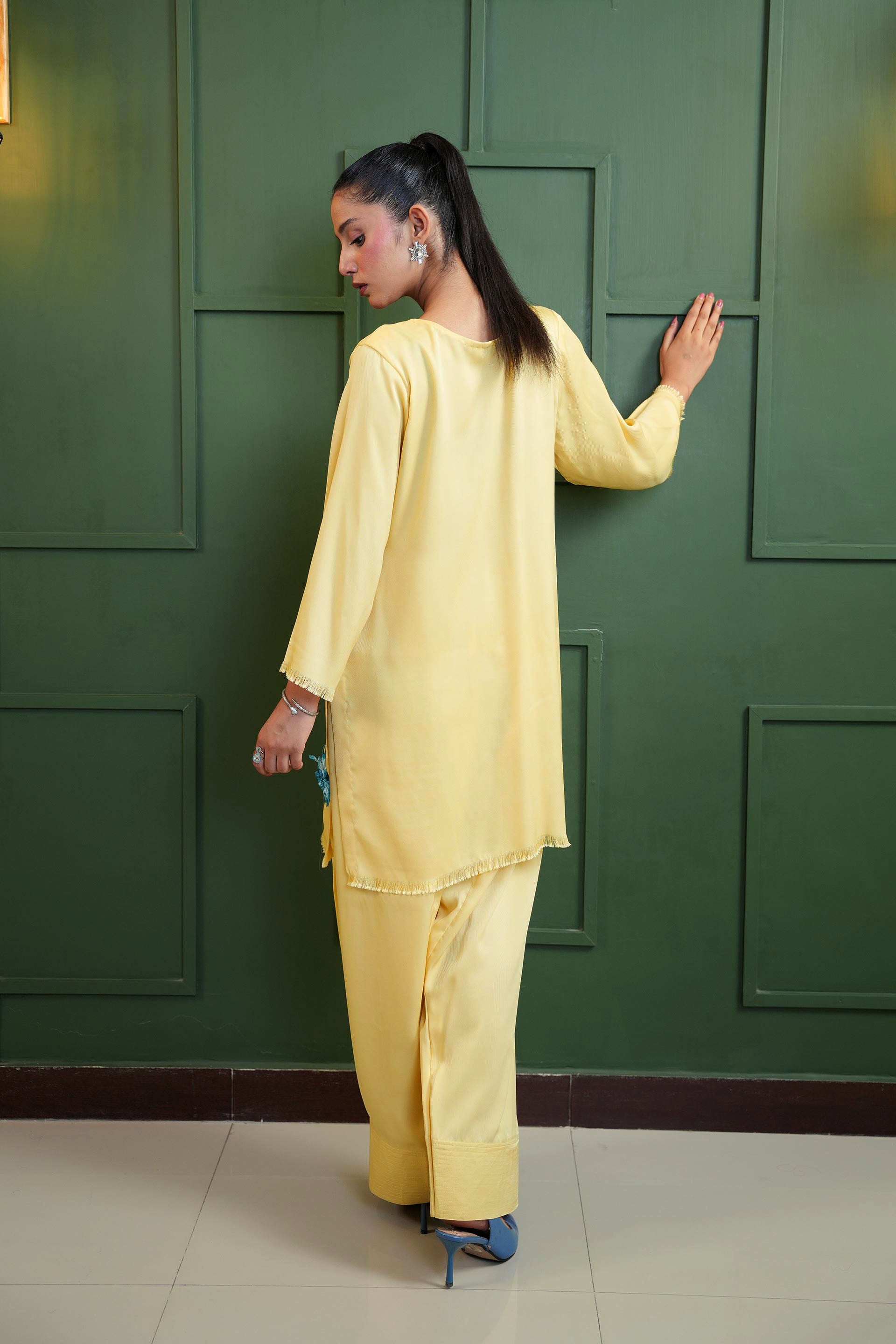 • This Butter Yellow Farshi ensemble features luxurious butter georgette fabric in a rich plum hue, paired with matching straight trousers.