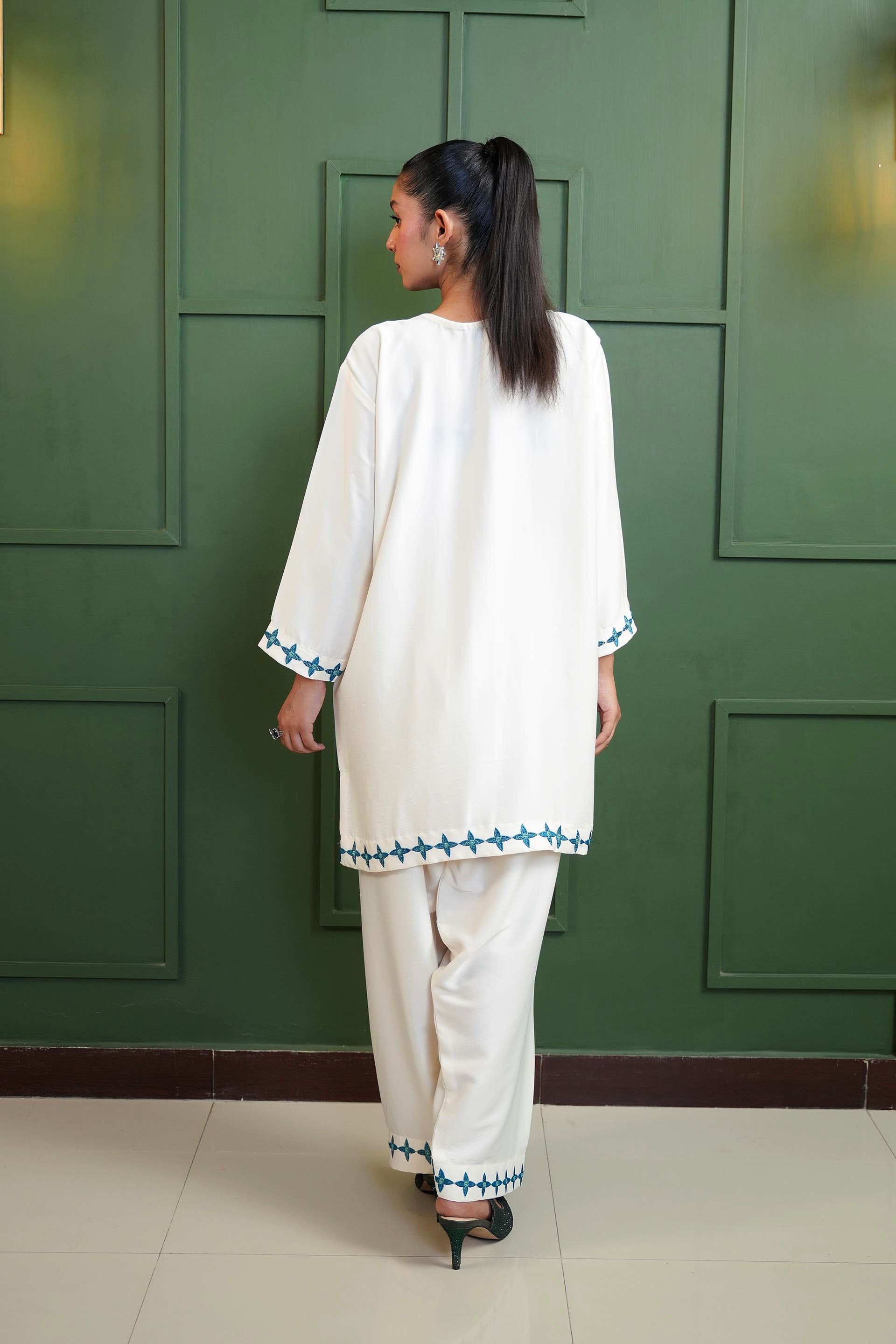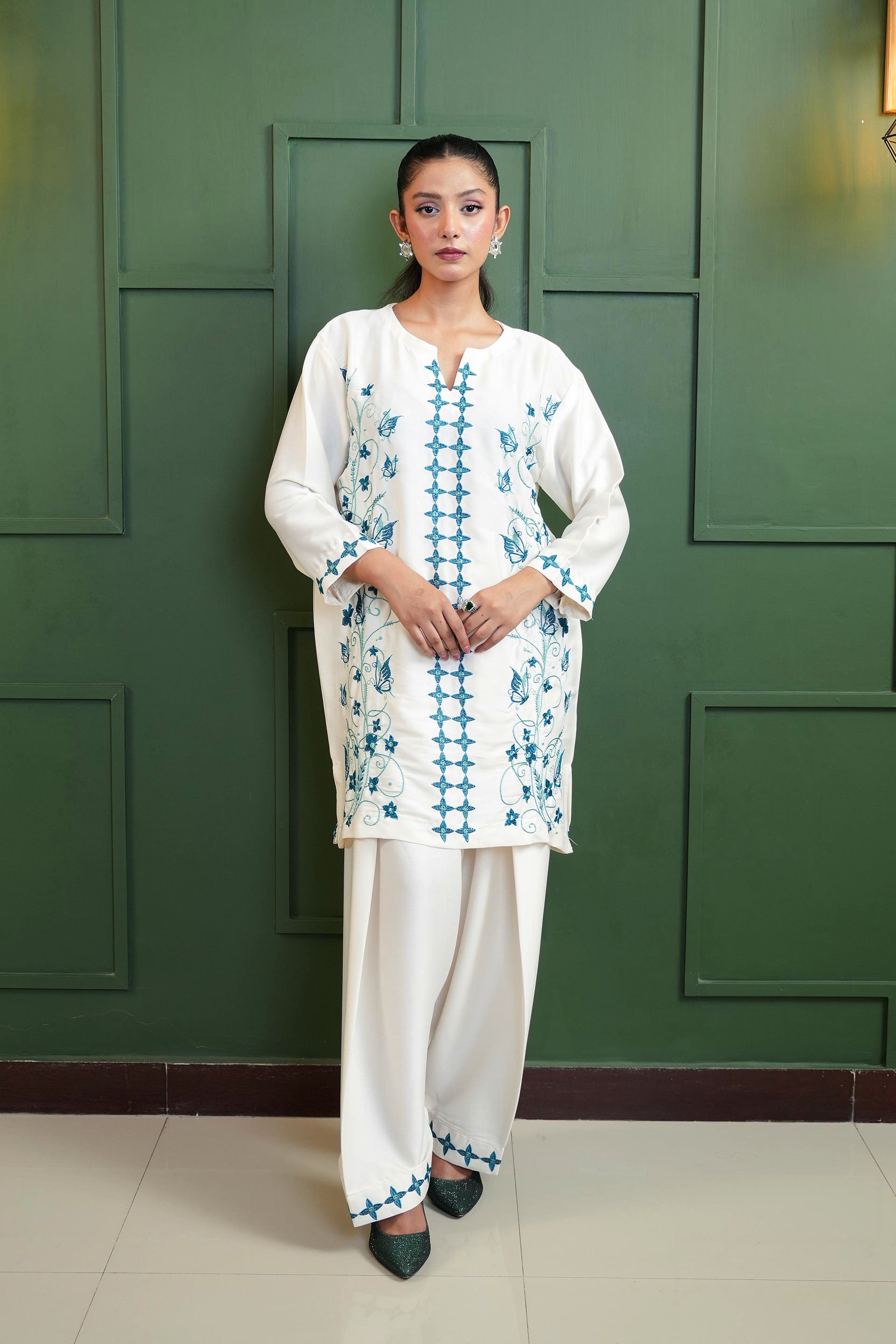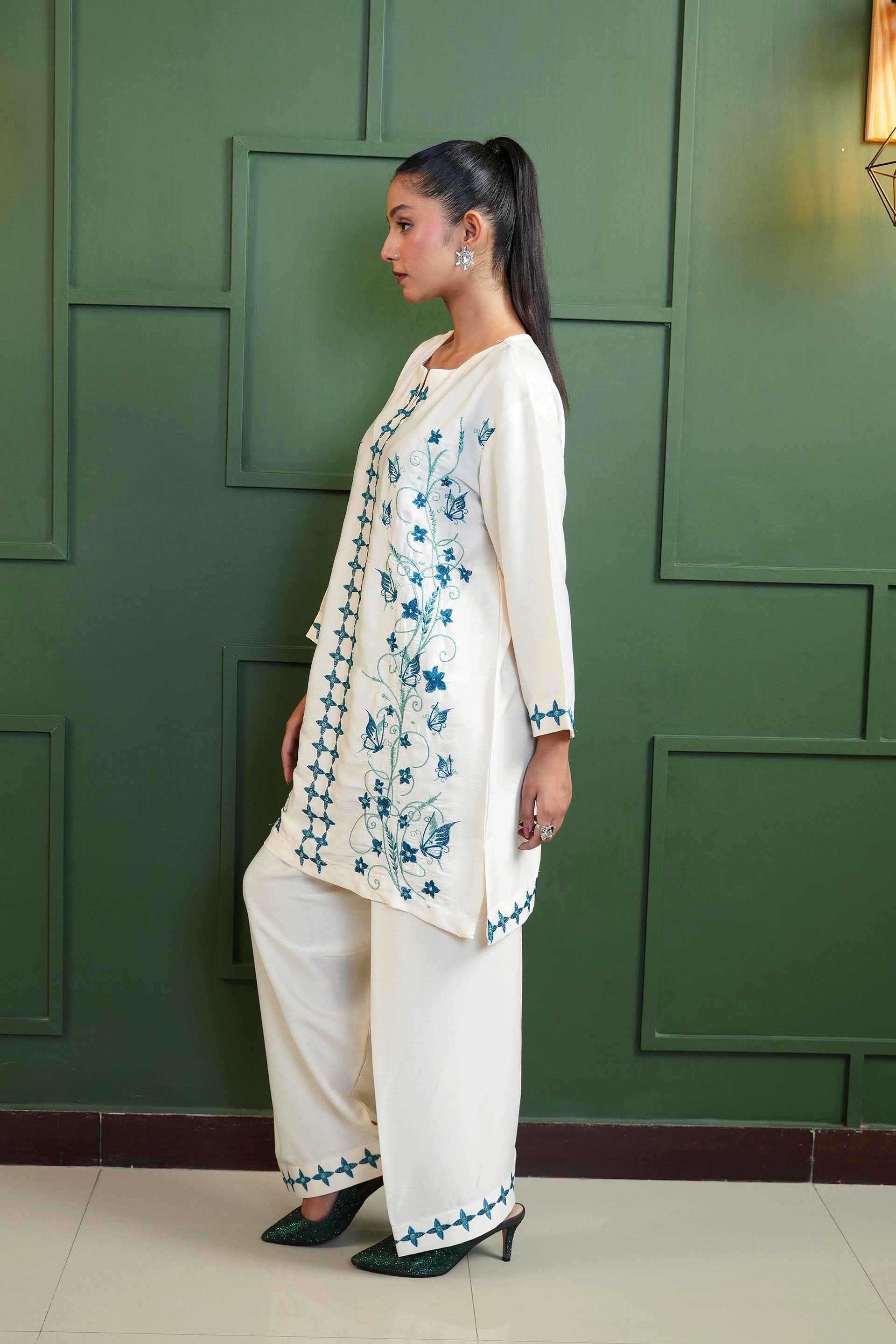 • This refined traditional two-piece ensemble features a long ivory kurta crafted from luxurious Turkish silk, elegantly detailed with delicate teal blue floral embroidery running symmetrically down the front