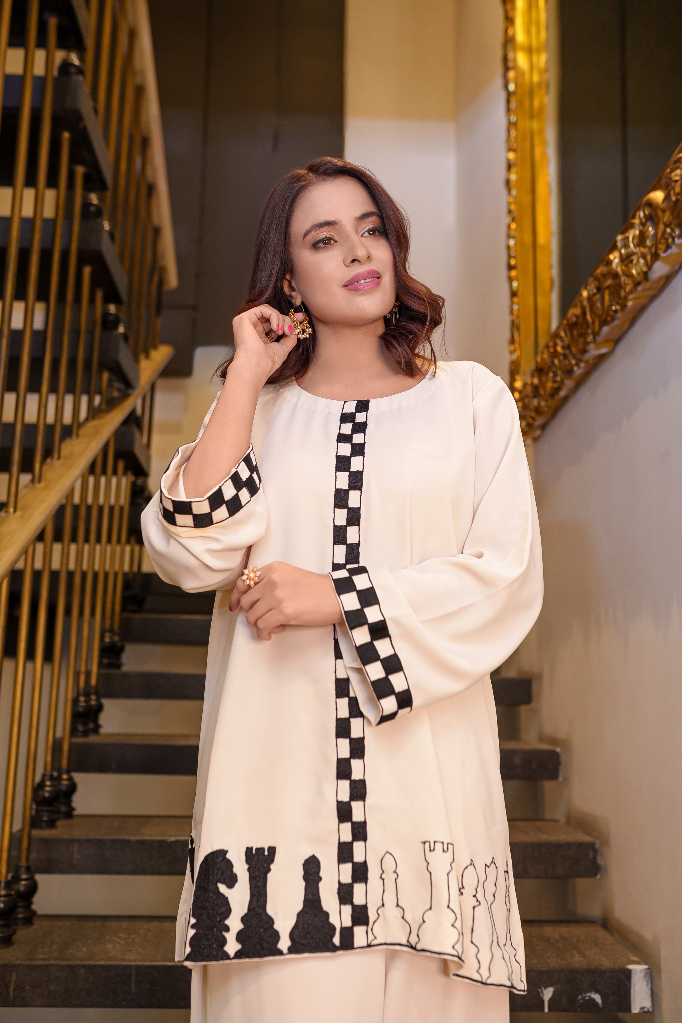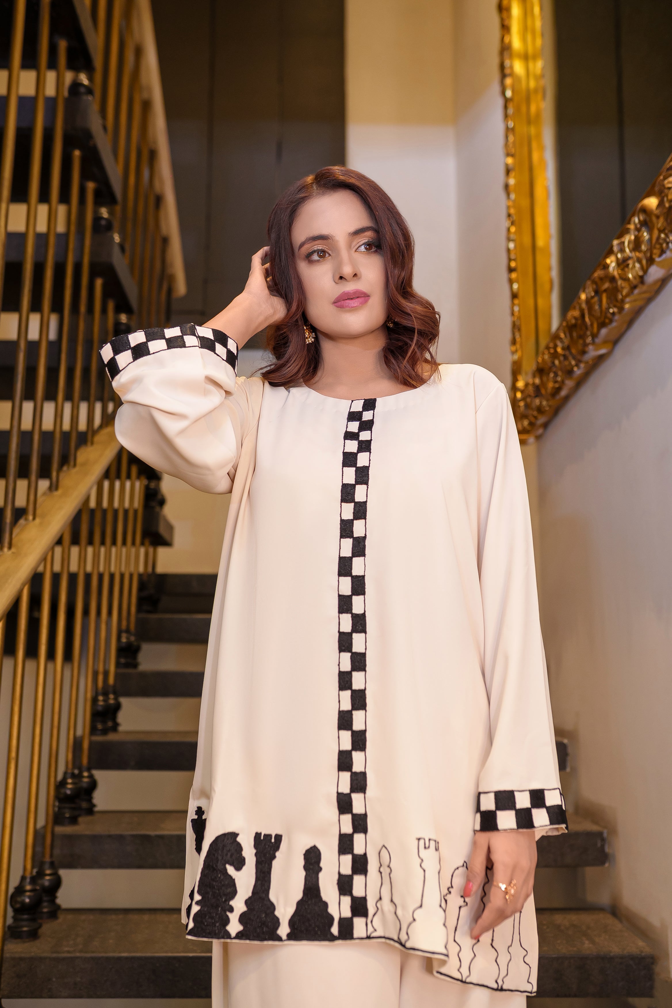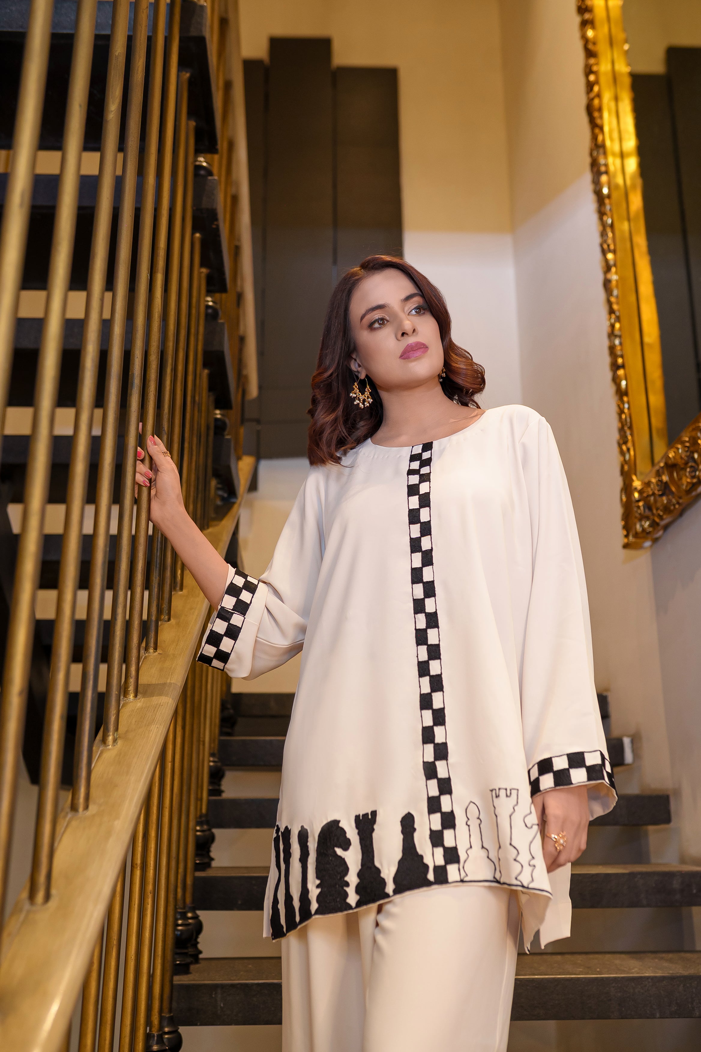 • Bold black chess-inspired detailing adds an unexpected edge to the ensemble.