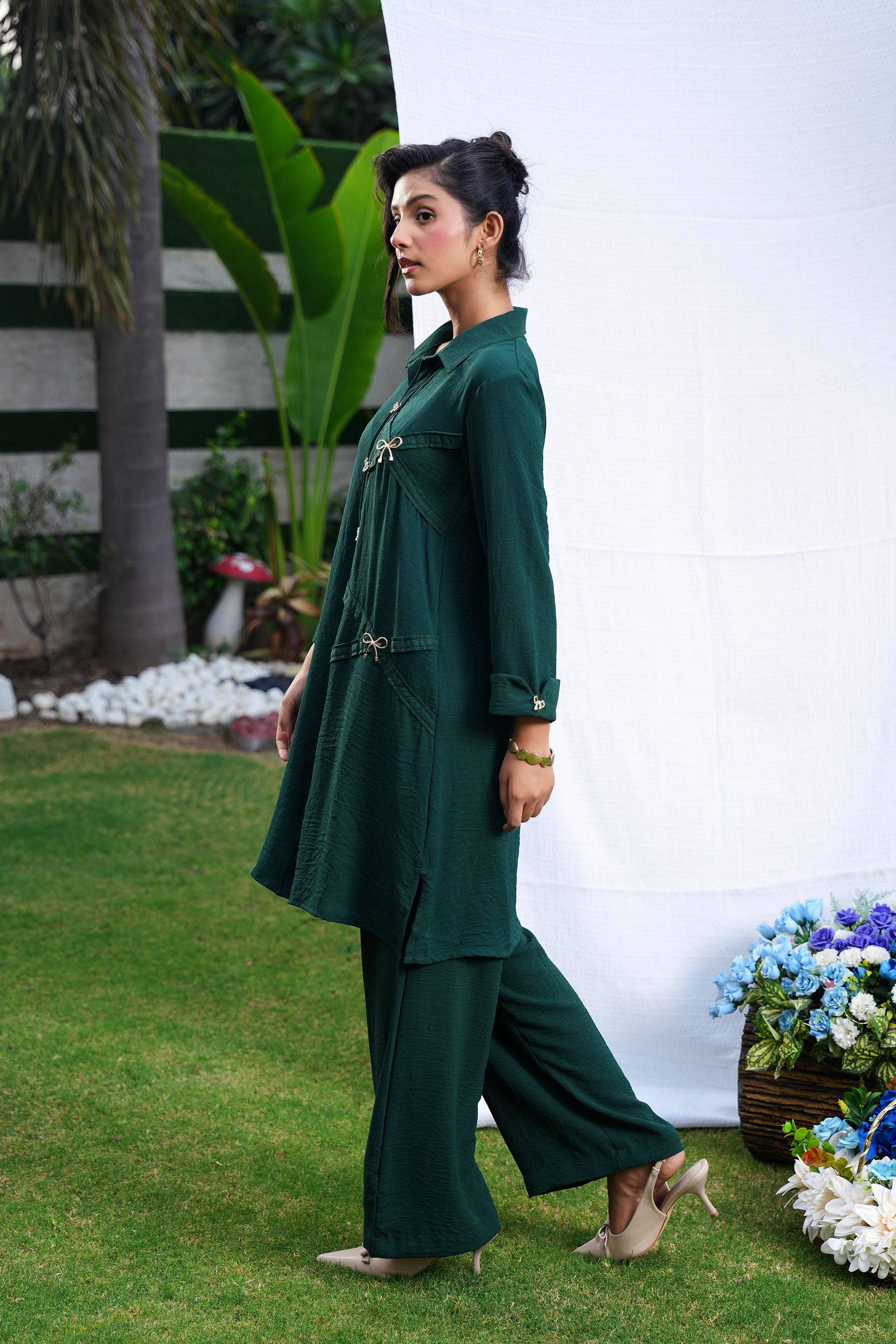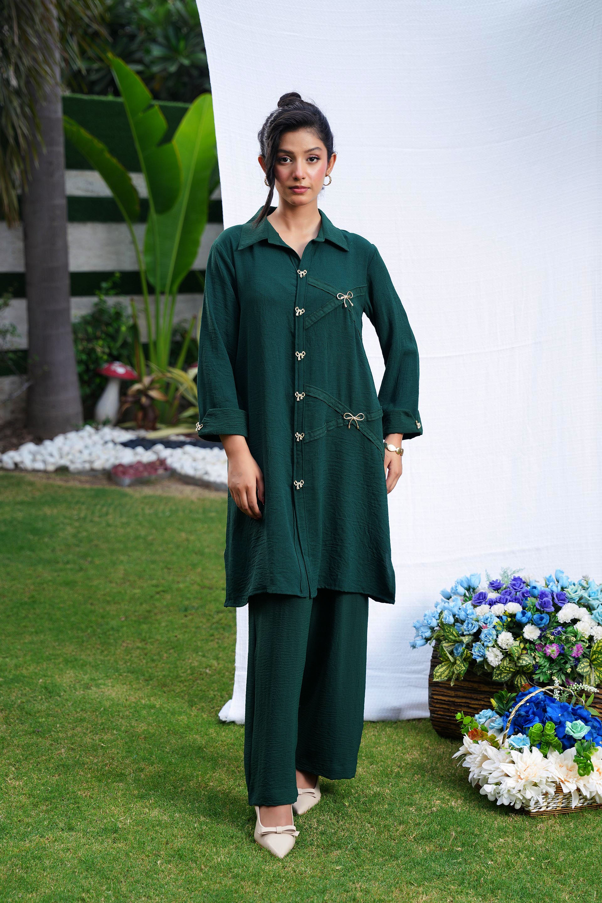 • This elegant emerald green co-ord set crafted from buttery georgette fabric features delicate golden metallic bows that introduce a subtle touch of glamour.