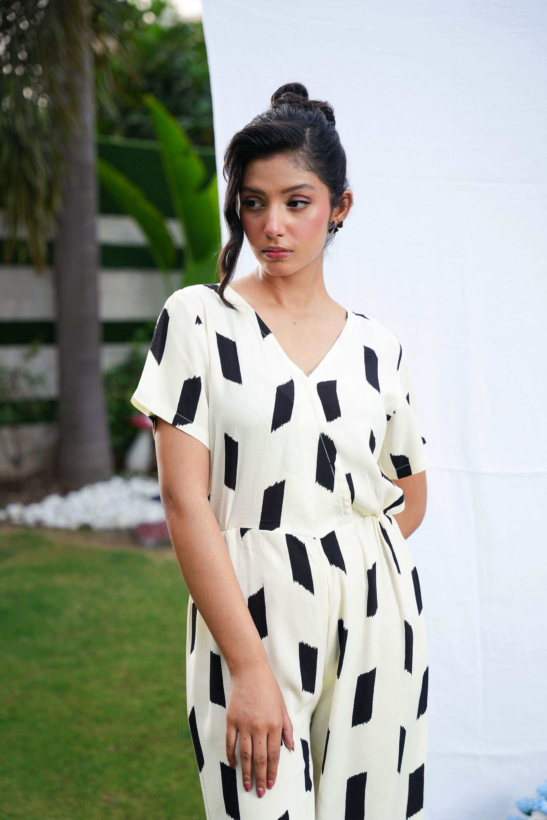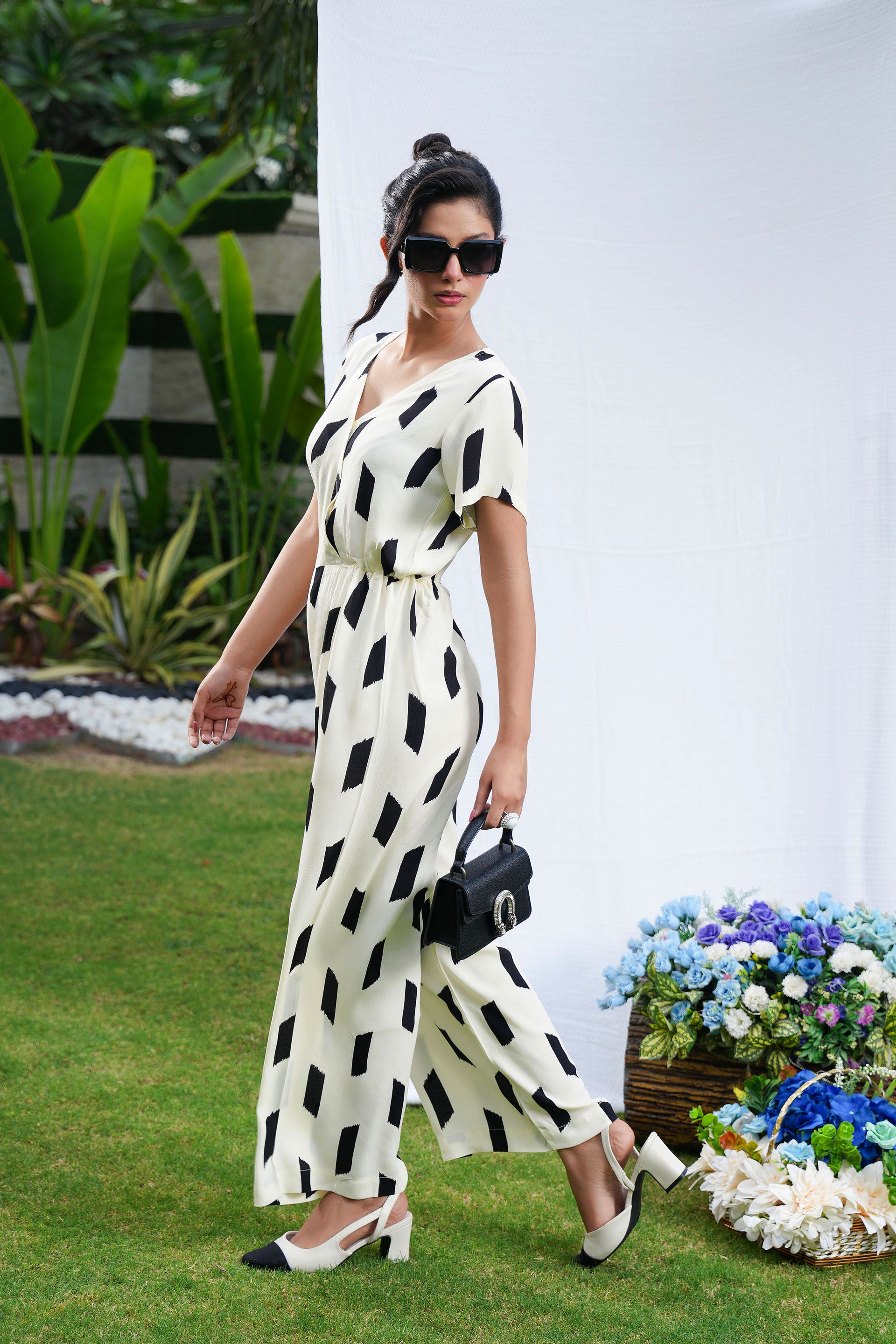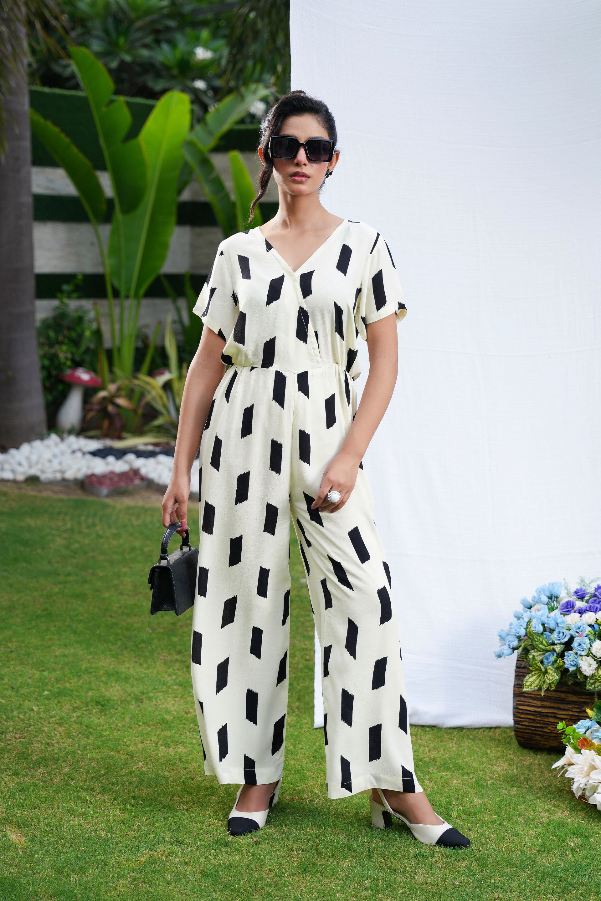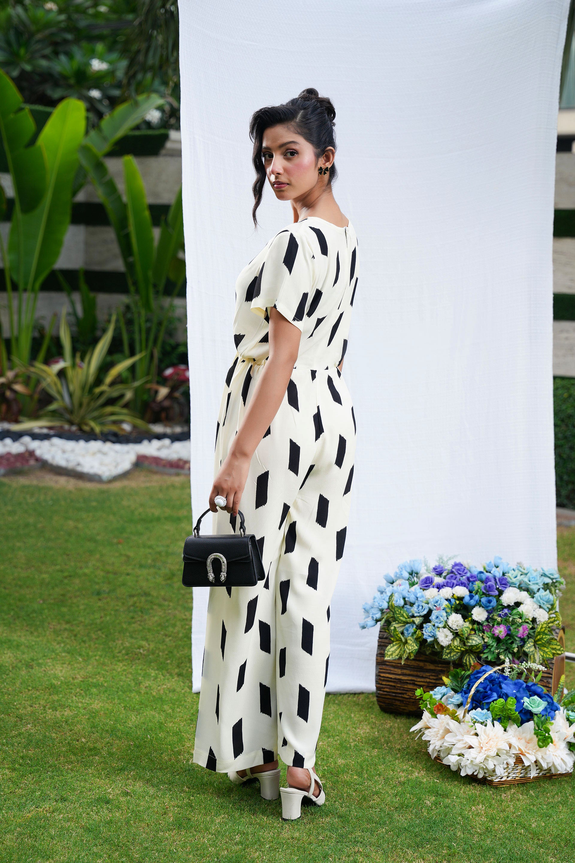 • The Graphite Jumpsuit is expertly crafted from lightweight butter georgette, offering a fluid and breathable feel.