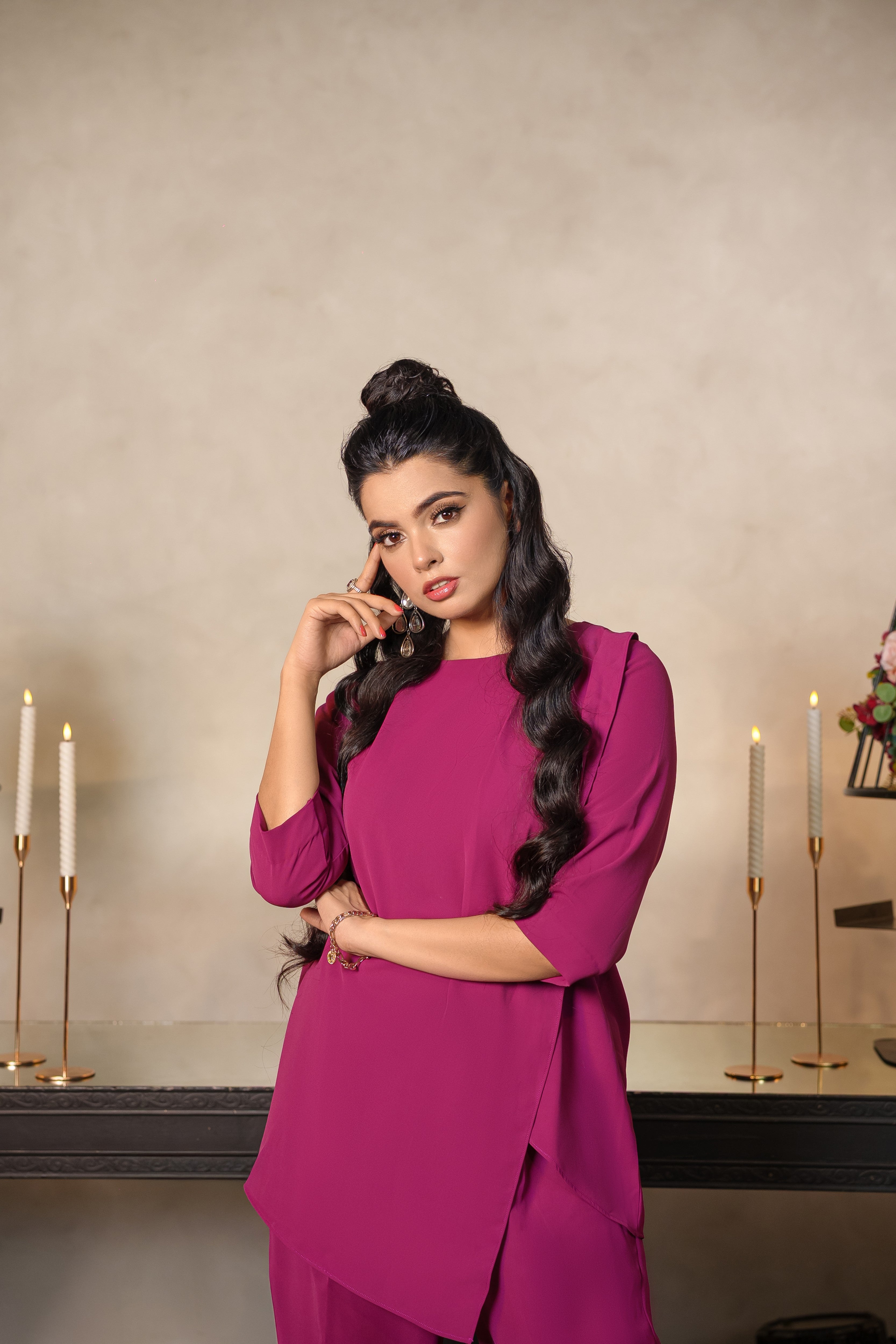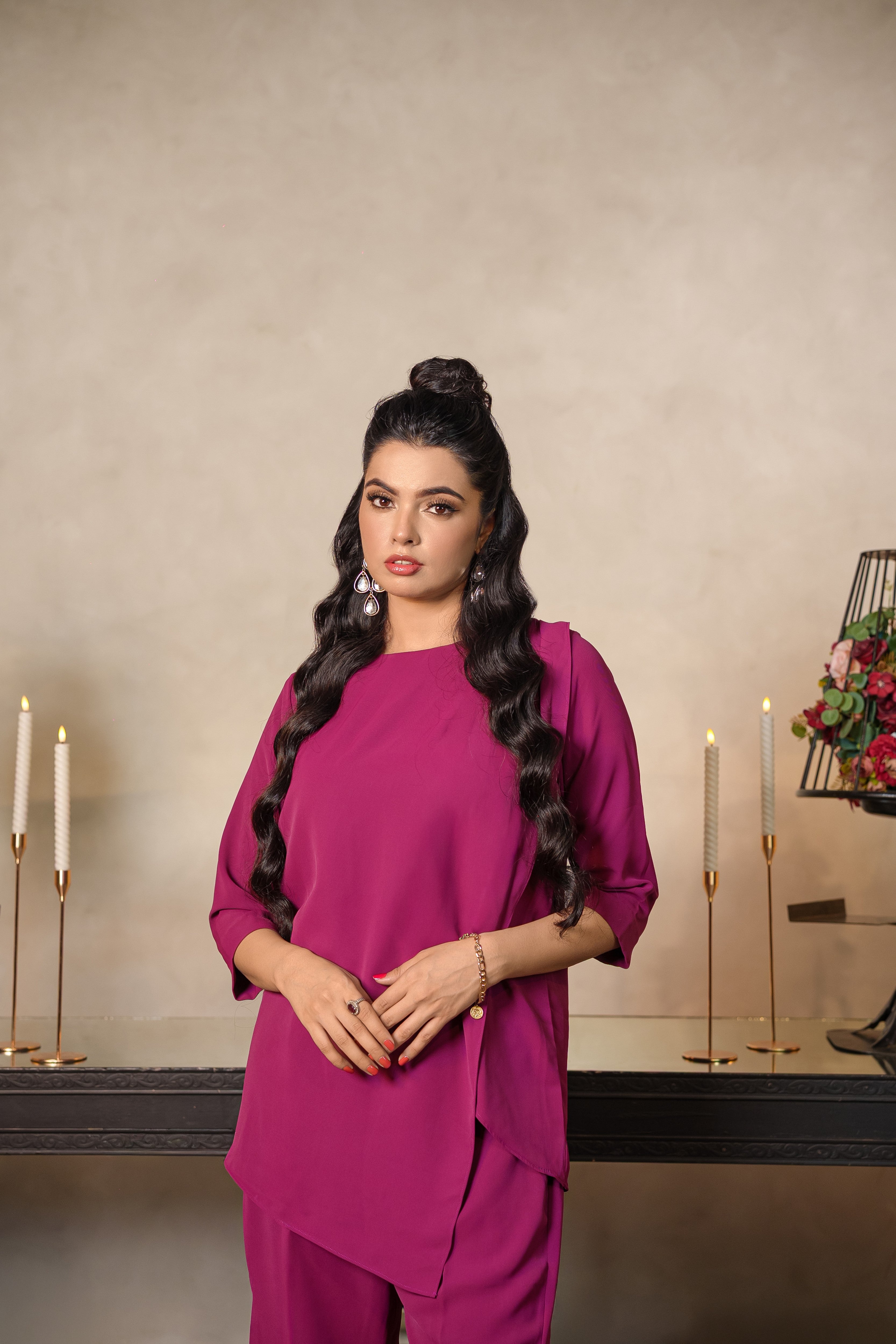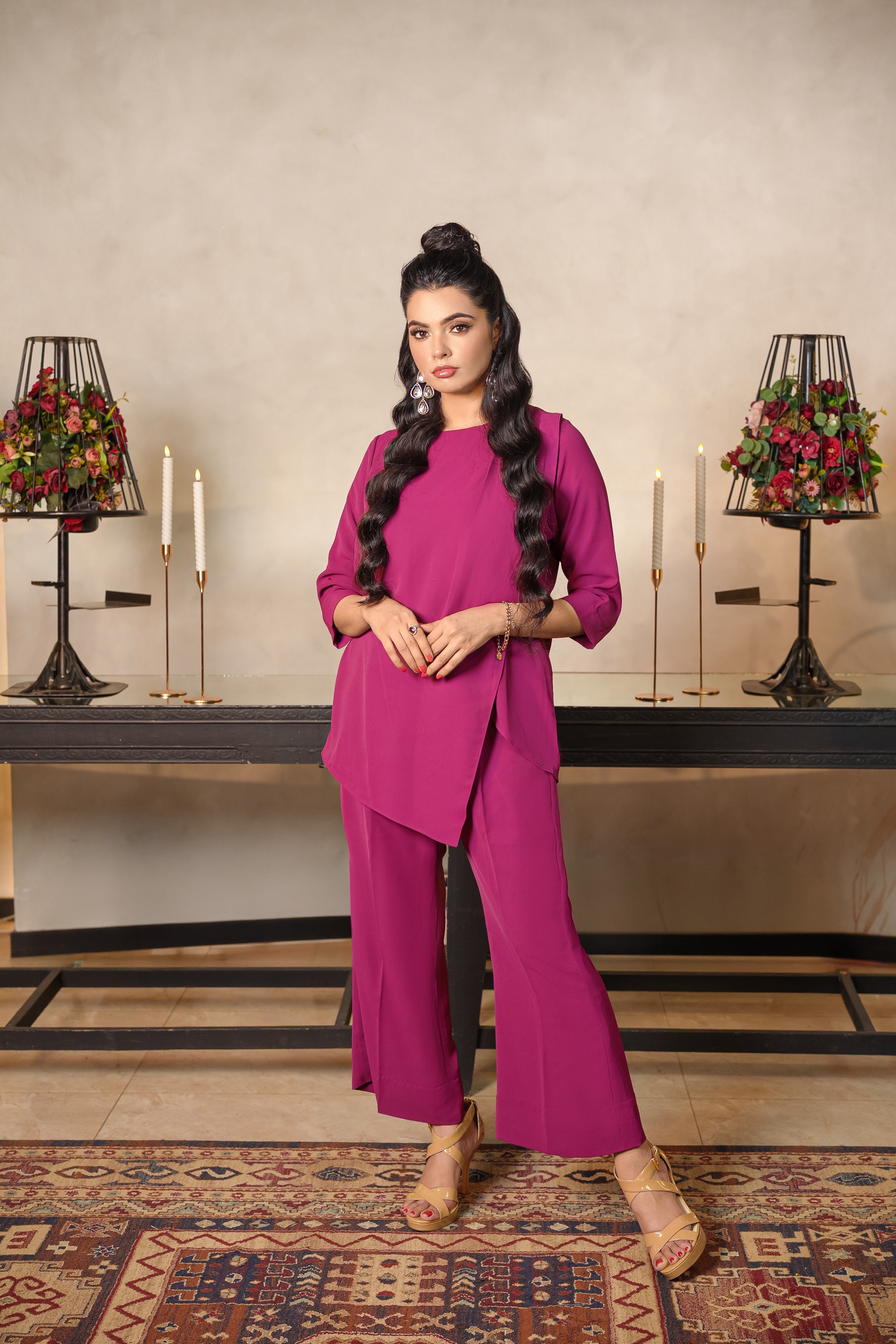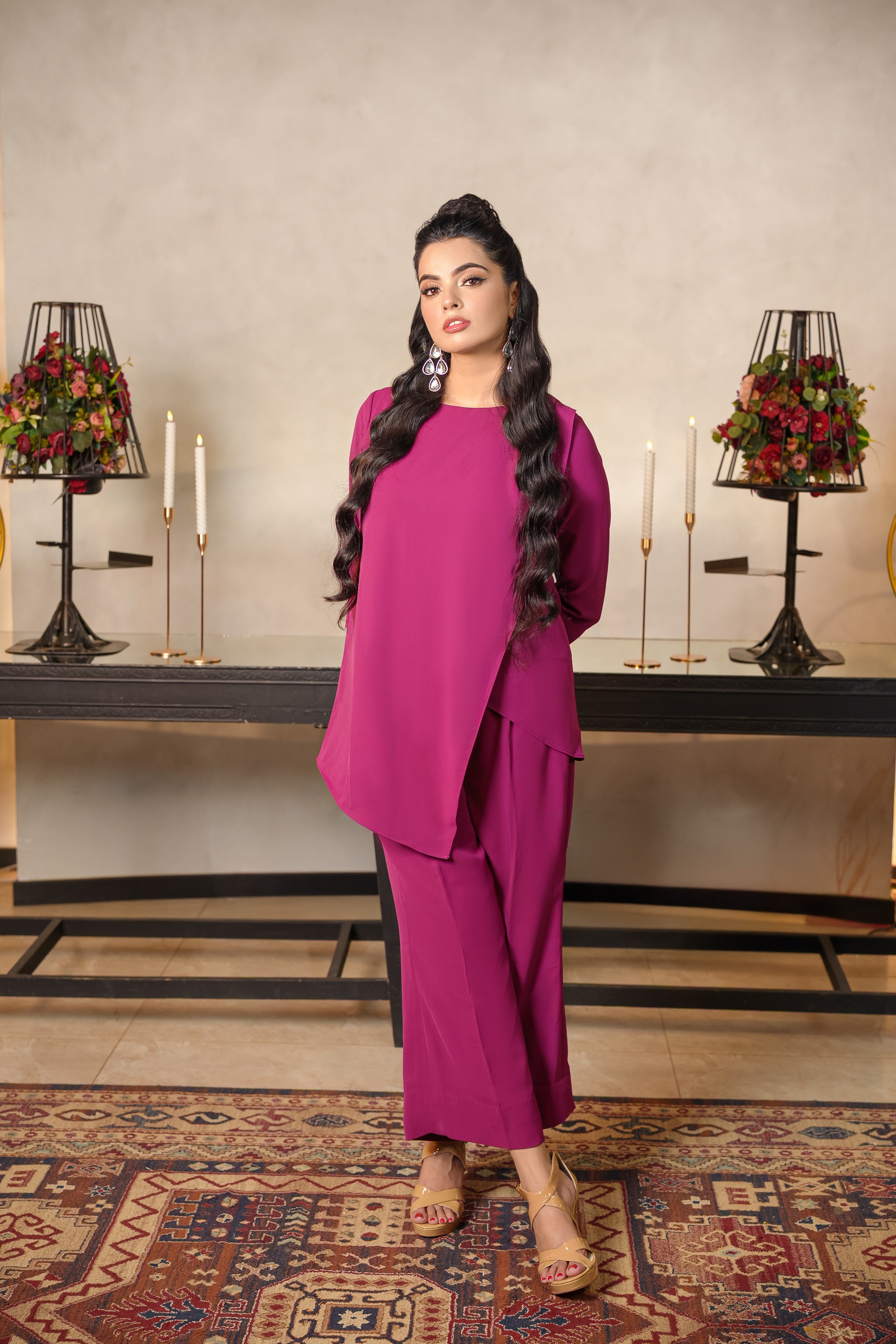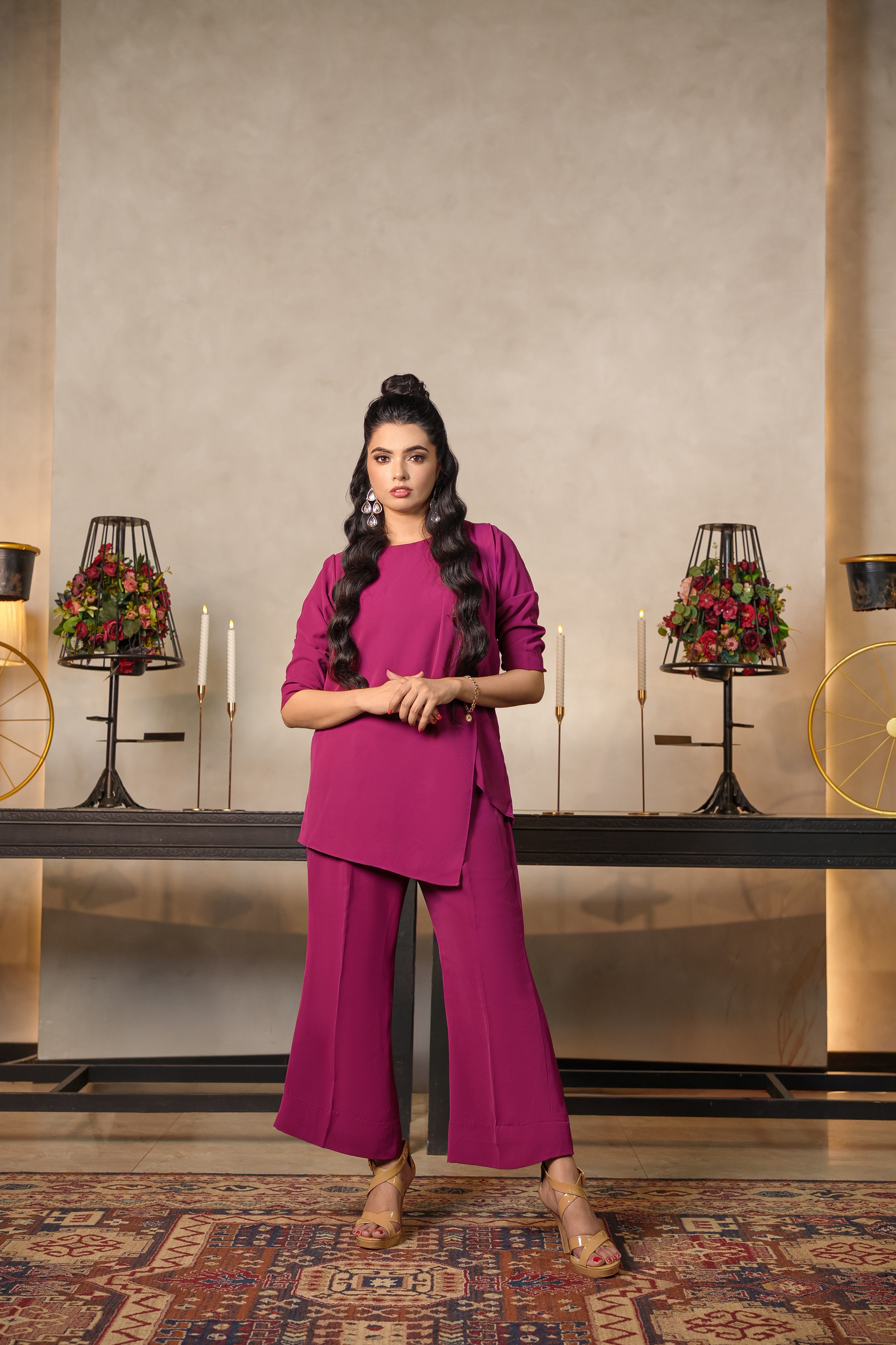 • Striking magenta co-ord set crafted from premium CY fabric.