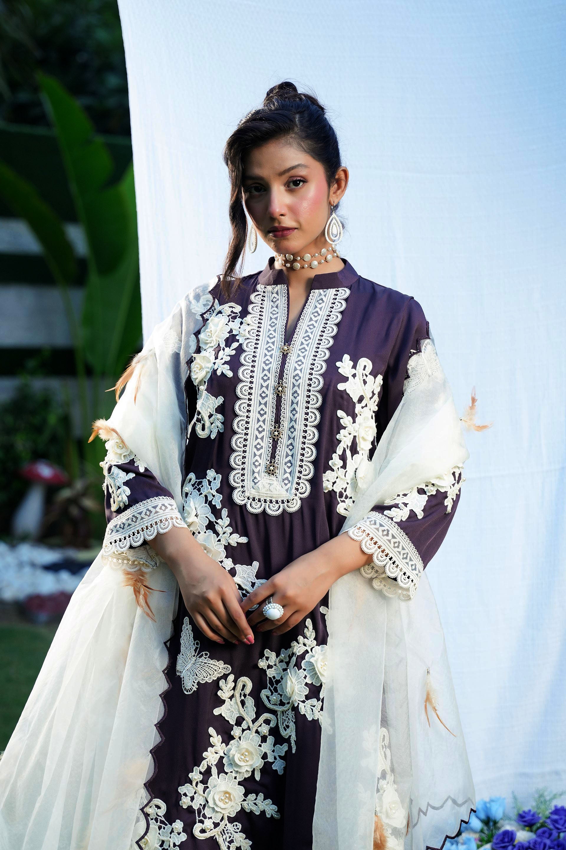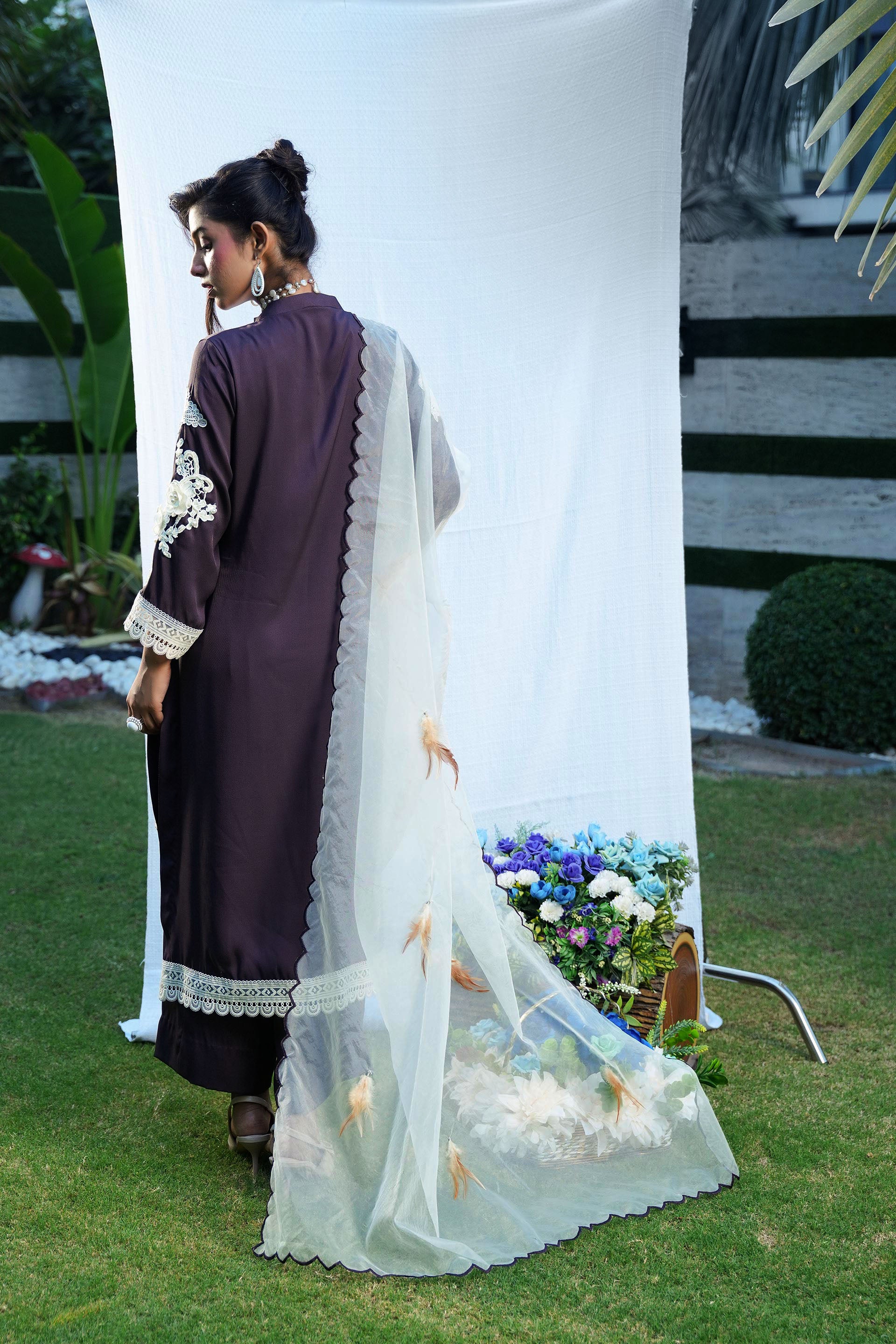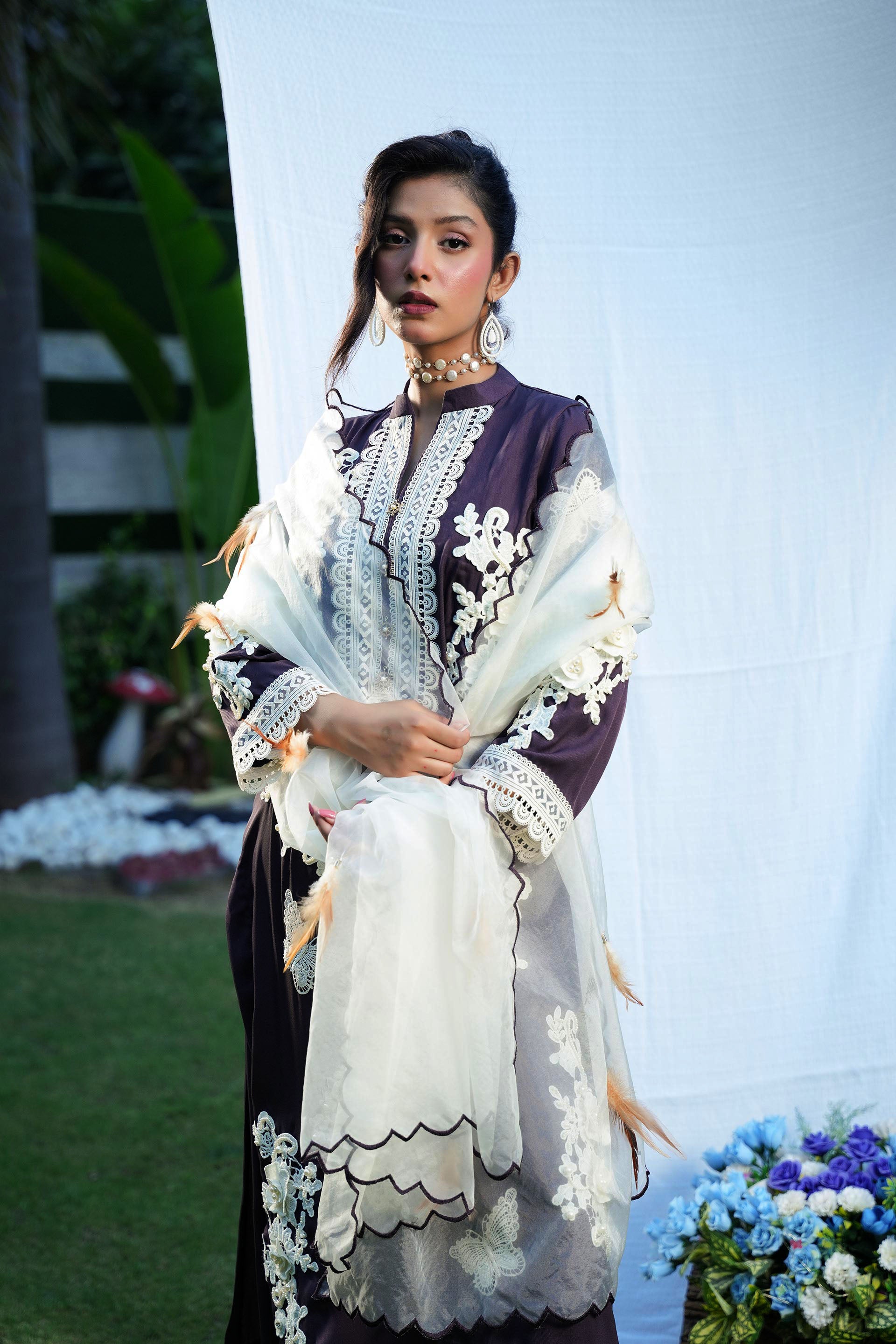 •  Elegant white embroidered patches enhance the outfit with subtle sophistication, while the statement dupatta, delicately trimmed with soft feathers, adds a dramatic and luxurious finishing touch.