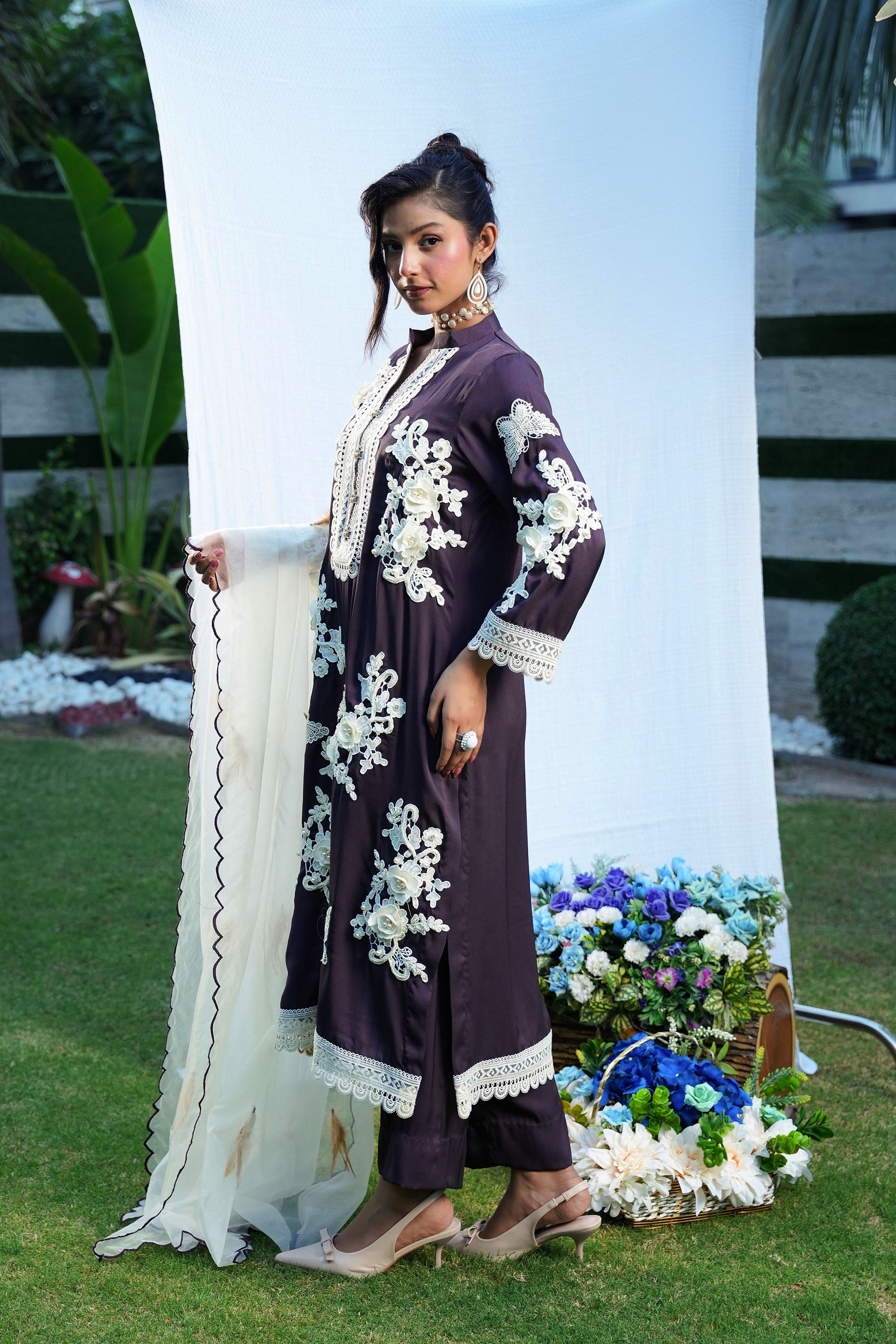 • This Plum Dunes ensemble features luxurious butter georgette fabric in a rich plum shade, paired with matching straight trousers for a refined silhouette.