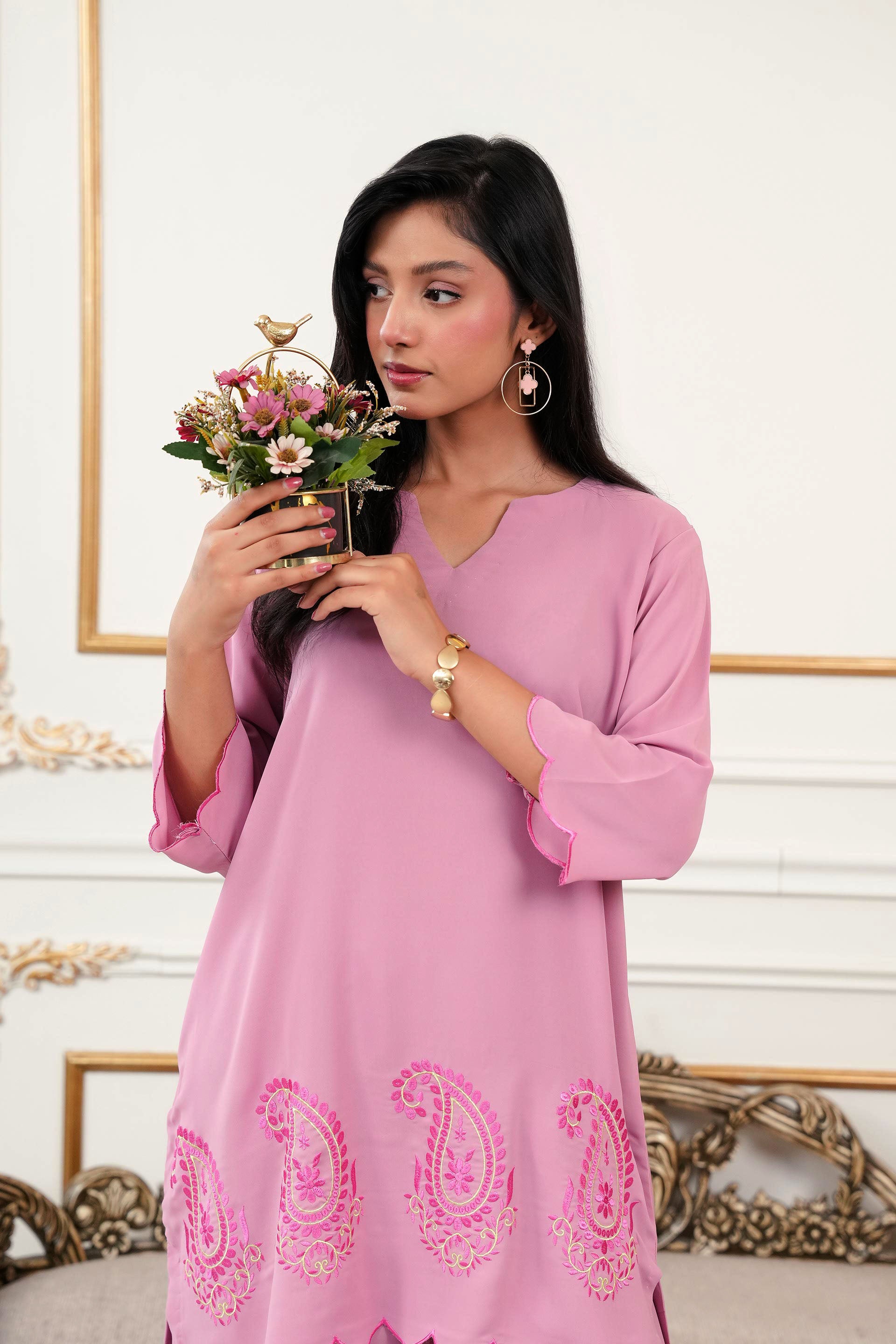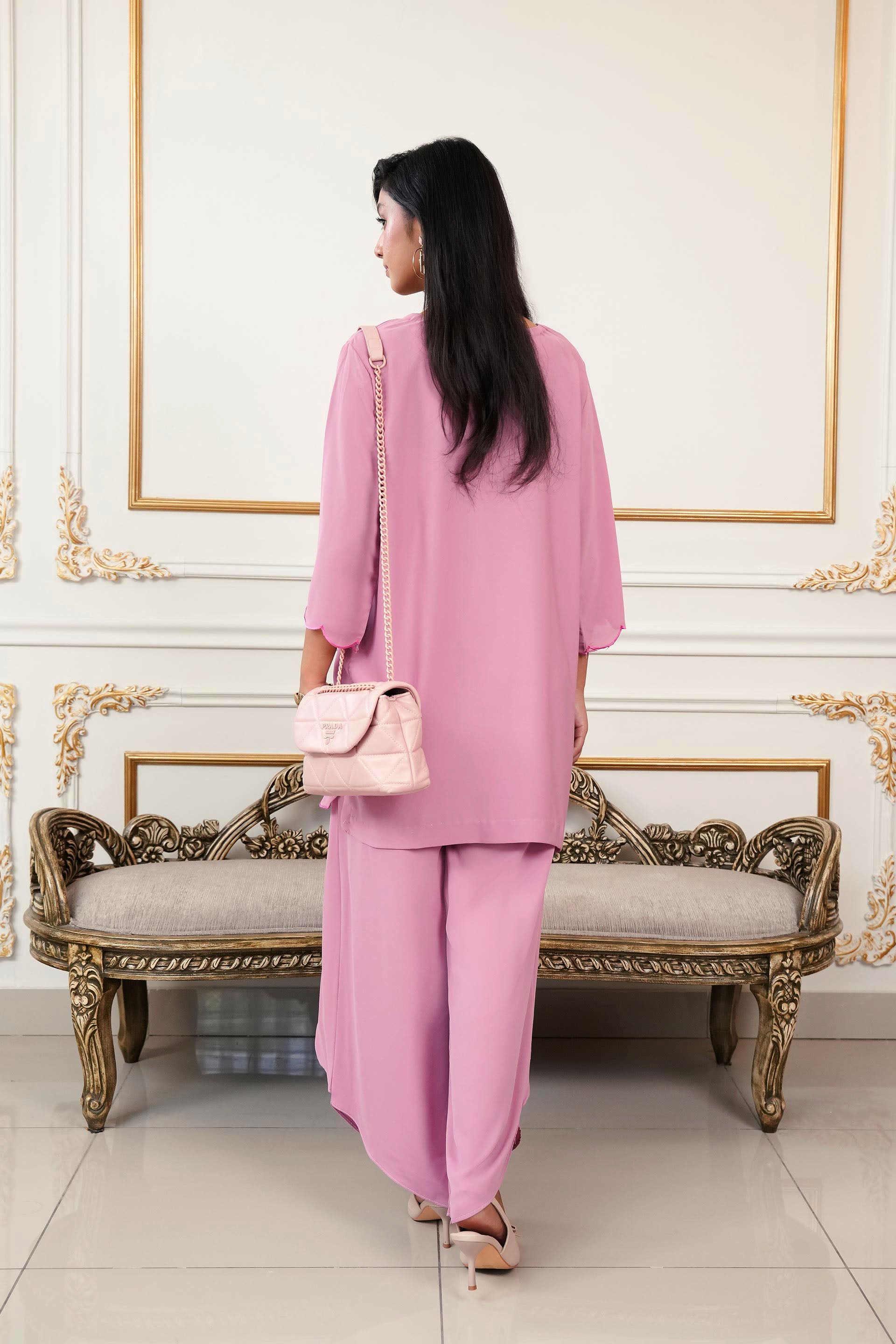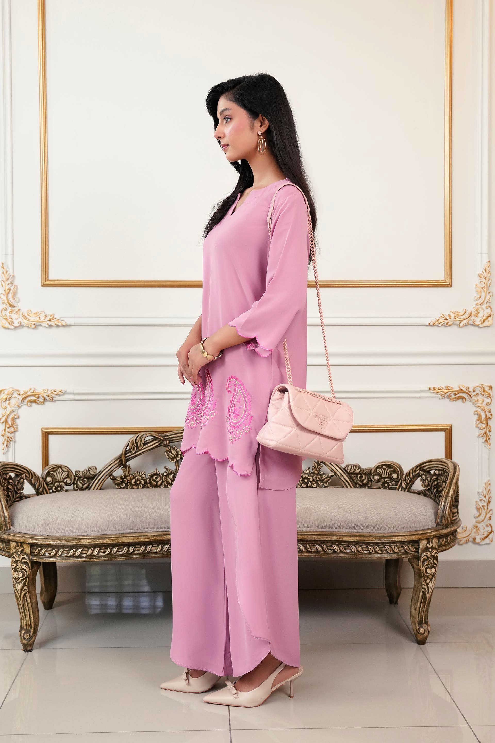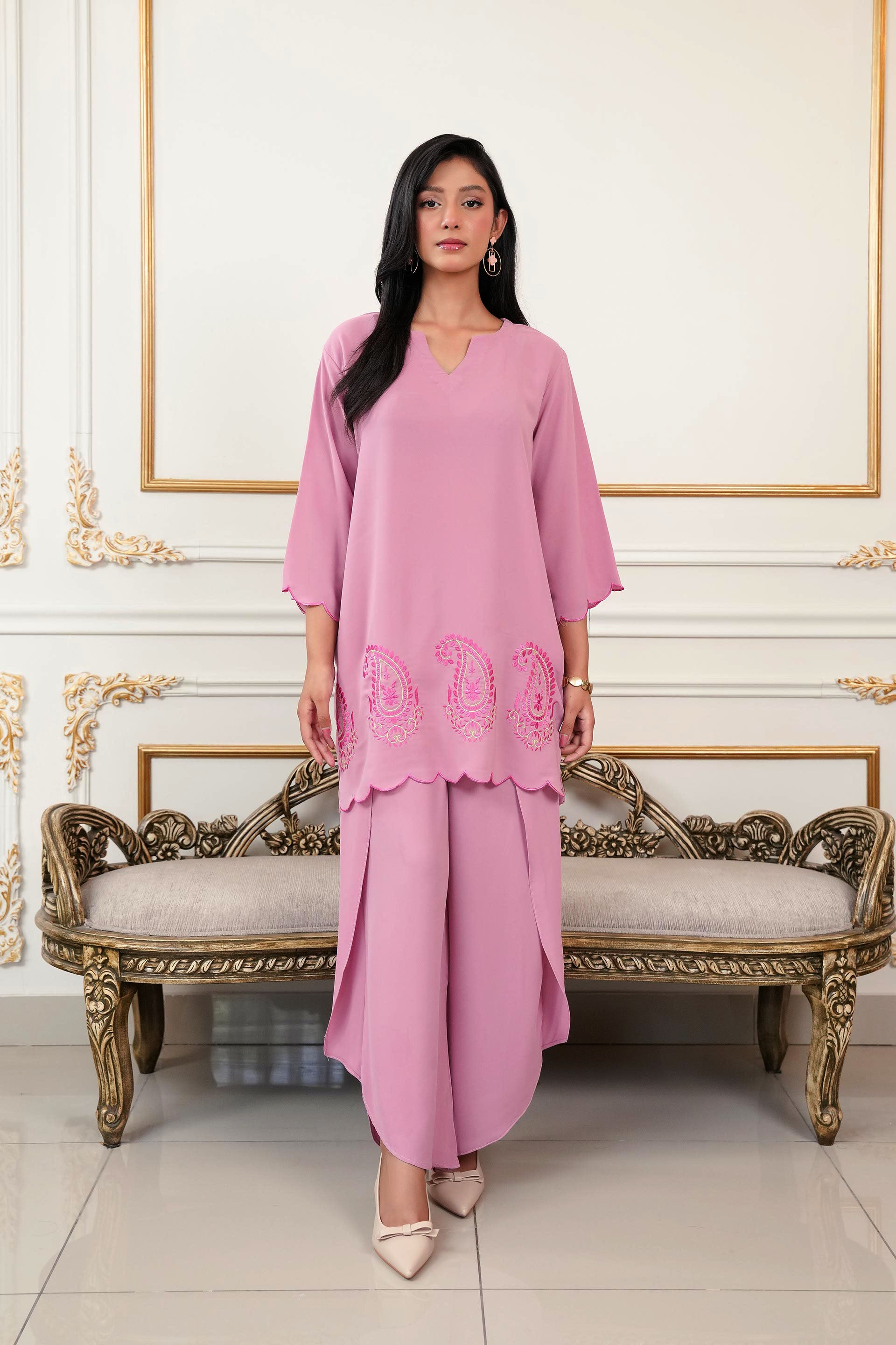 • Crafted from delicate butter georgette, the Rosie Set features a soft blush pink hue complemented by scalloped hems and detailed paisley embroidery.