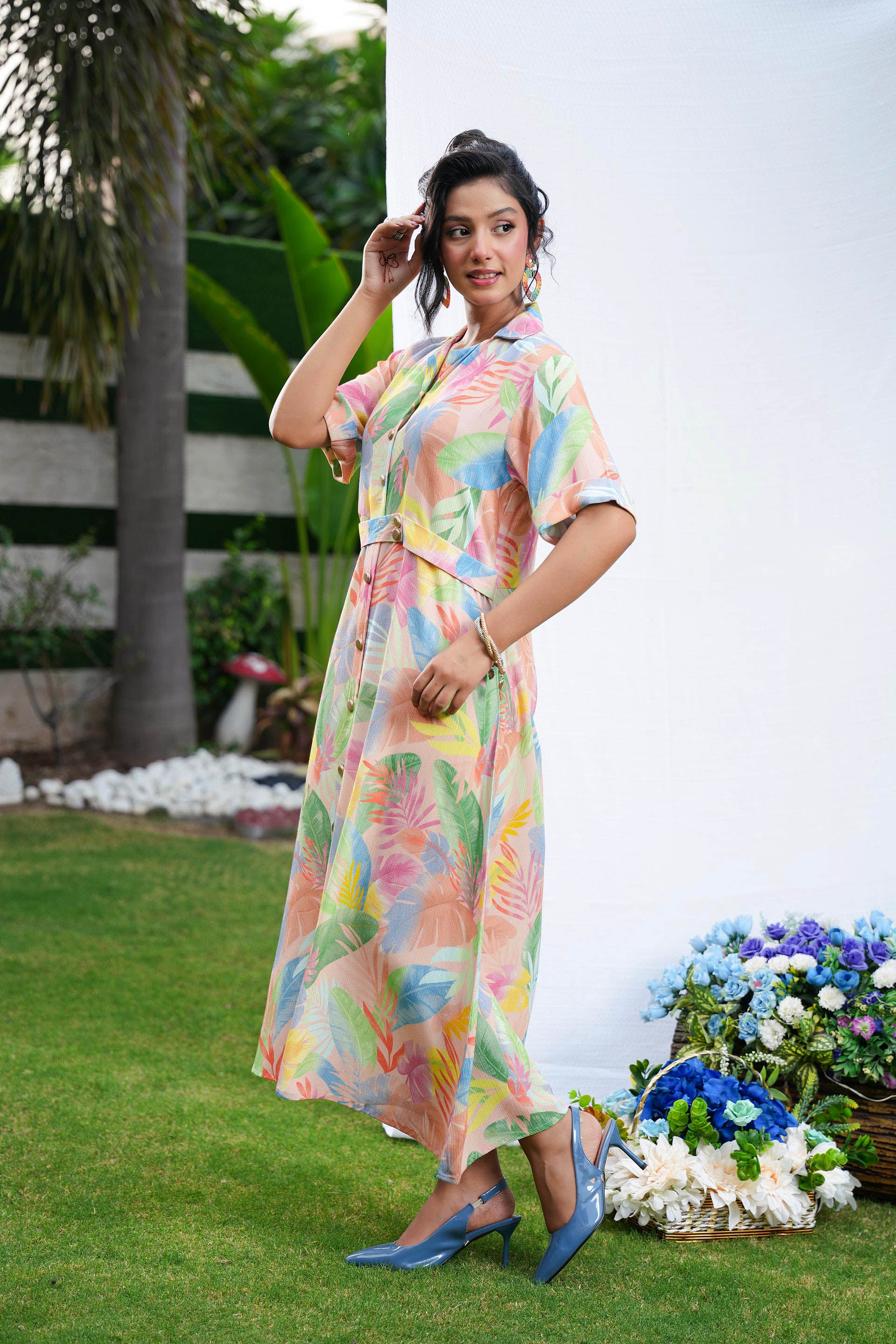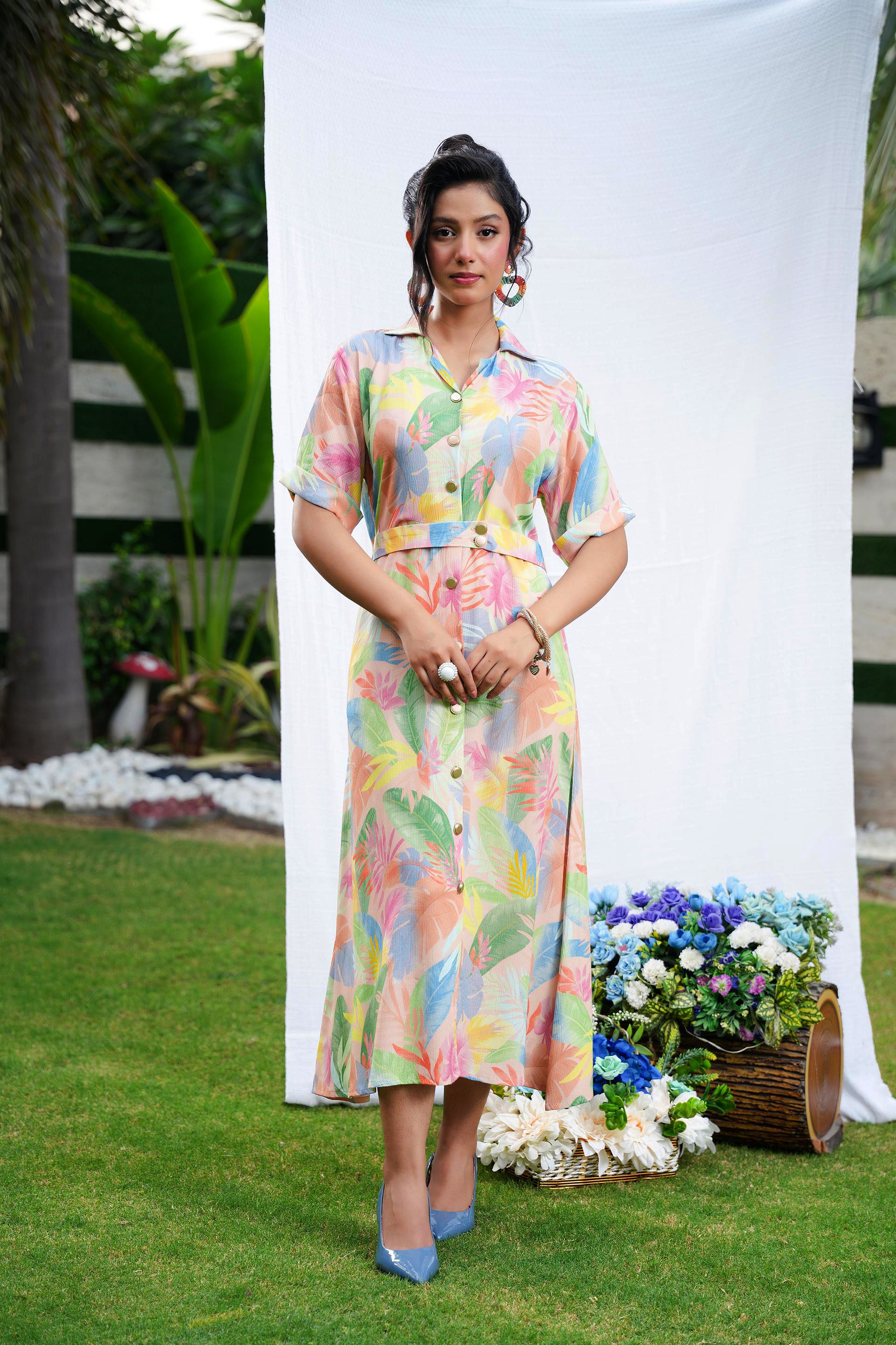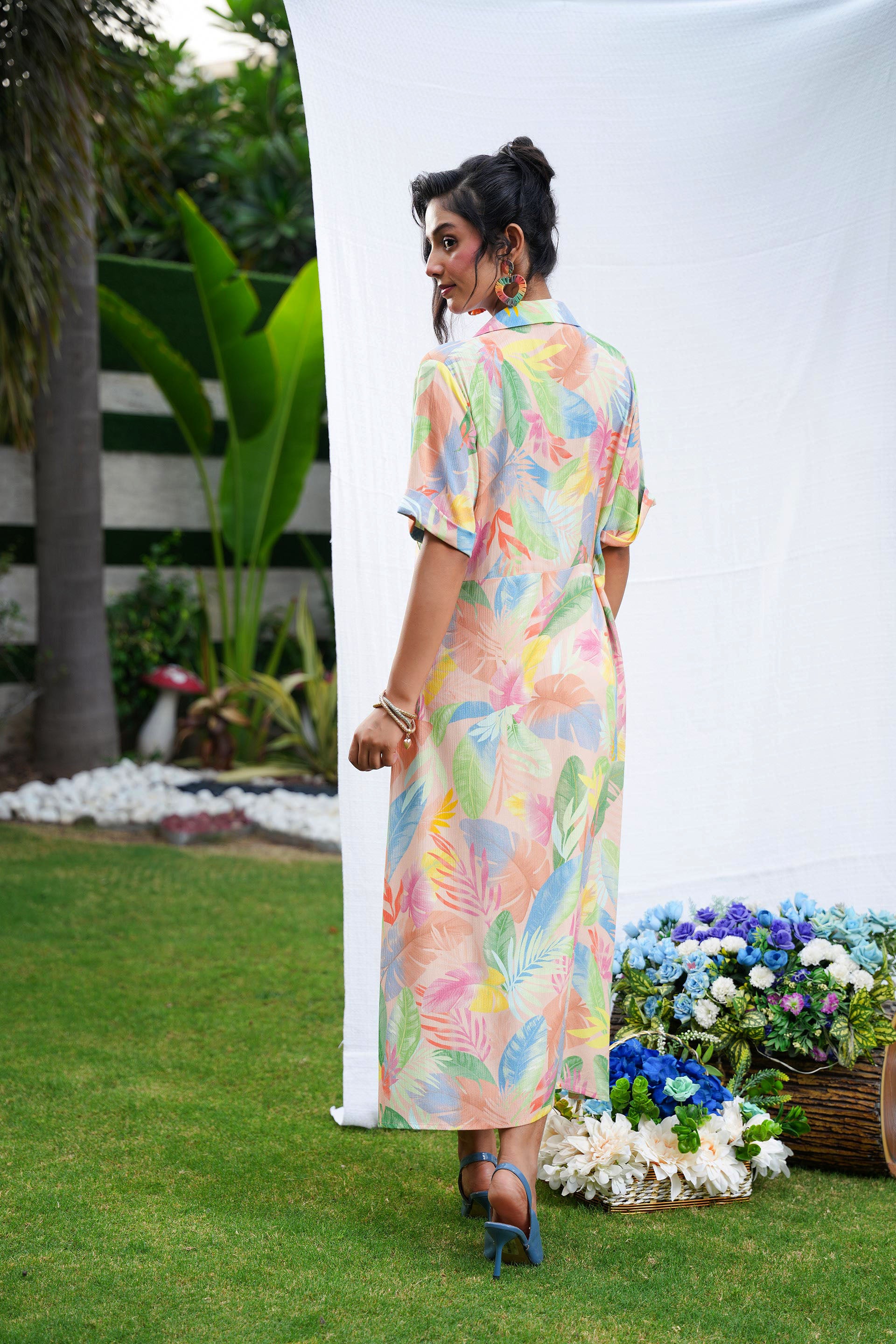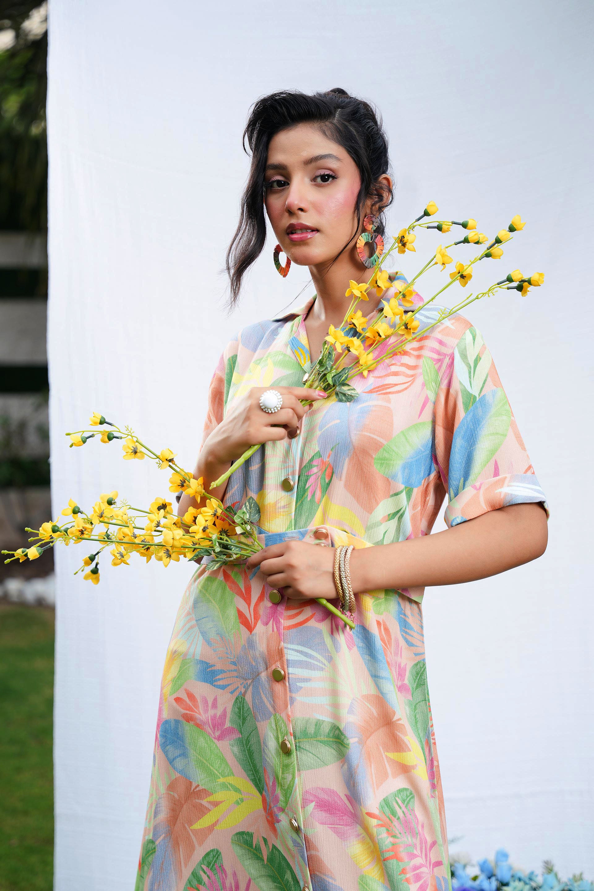 •  Its pastel tropical print blends soft pinks, peaches, greens, blues, and yellows, creating a fresh and elegant look.